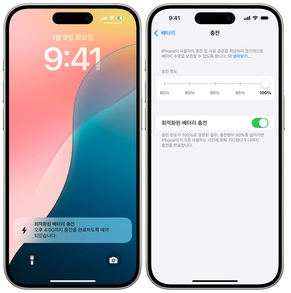 완전히 나쁘다고는 할 수 없지만, 반복적으로 100%까지 충전하고 그대로 오래 방치하면 배터리 열화가 빨라집니다. 가능하다면 80% 선에서 충전을 멈추는 것이 배터리 수명에 좋습니다.