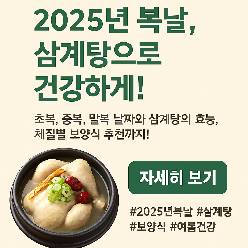 2025년 초복, 중복, 말복 날짜와 삼계탕의 효능, 체질별 보양식 추천까지! 무더운 여름, 삼계탕으로 건강하게 이겨내는 방법과 다양한 정보들을 자세히 알려드릴게요.