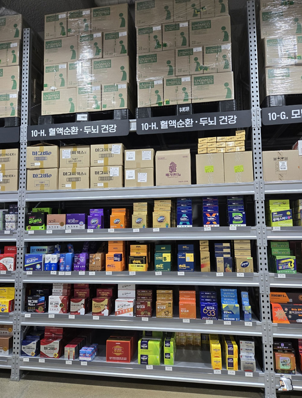 | 건강기능식품 존 | 비타민, 오메가3, 유산균 등 다양한 영양제를 진열 |