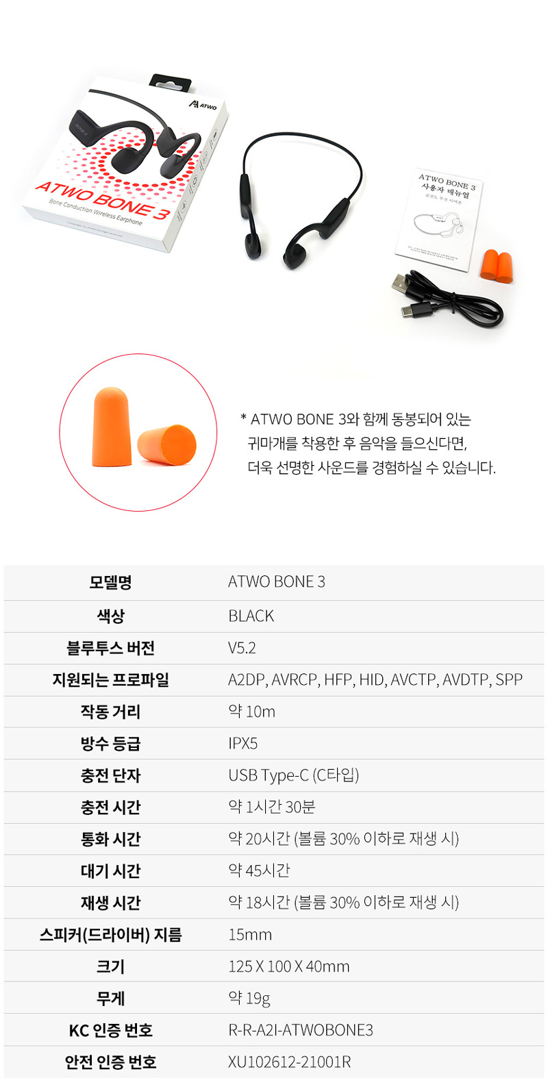 • 구성품: 본체, USB-C 케이블, 설명서, 이어팁 3종